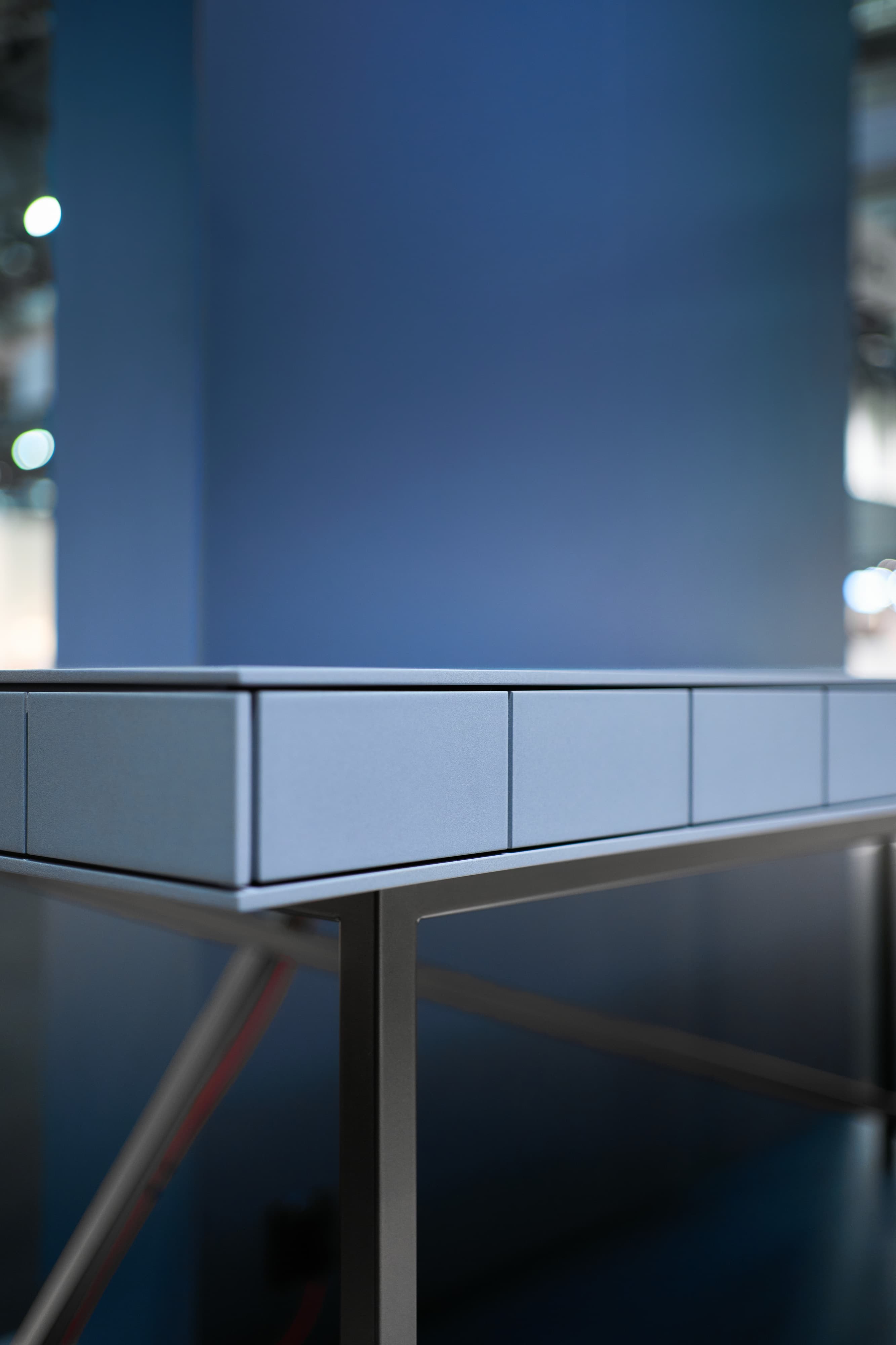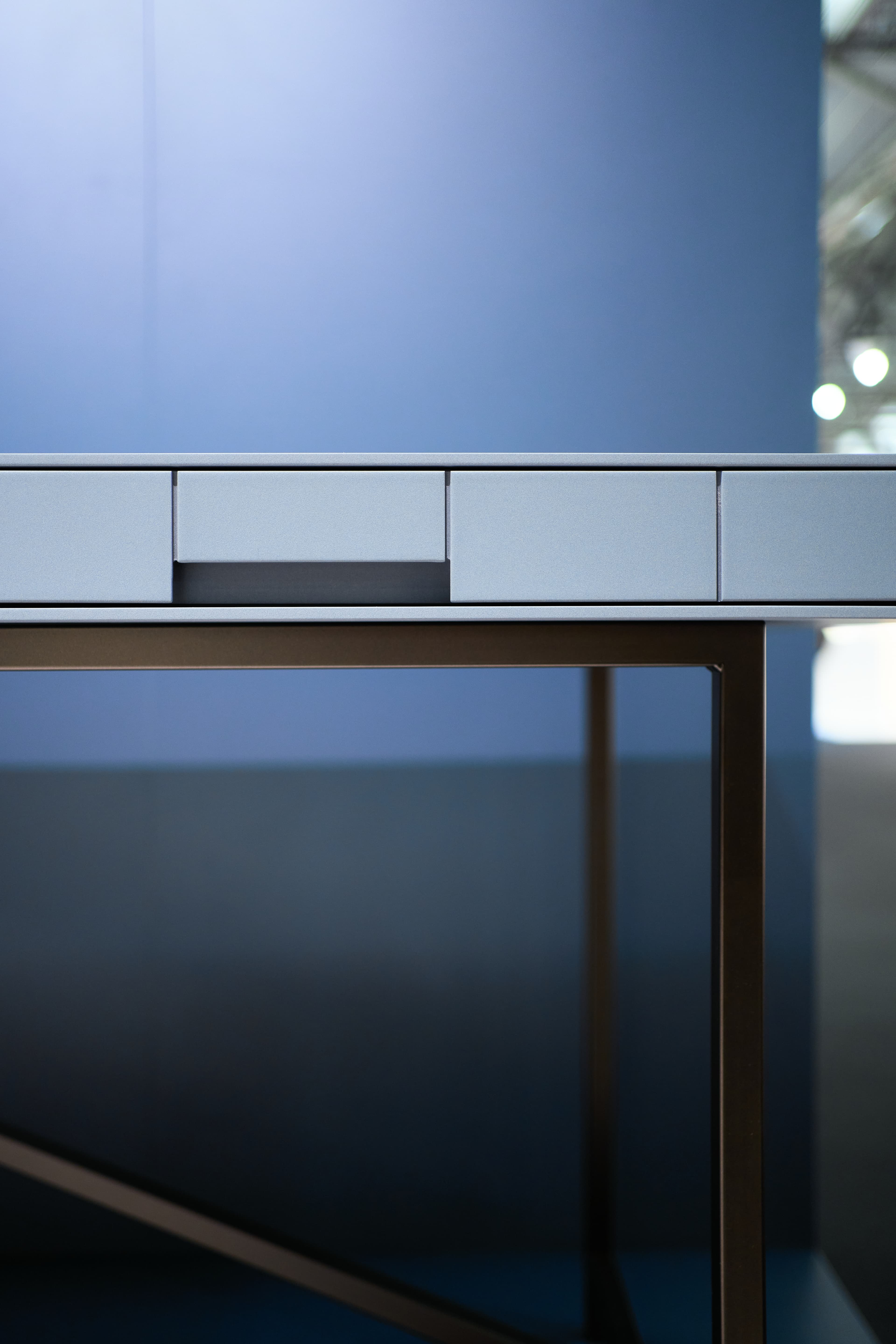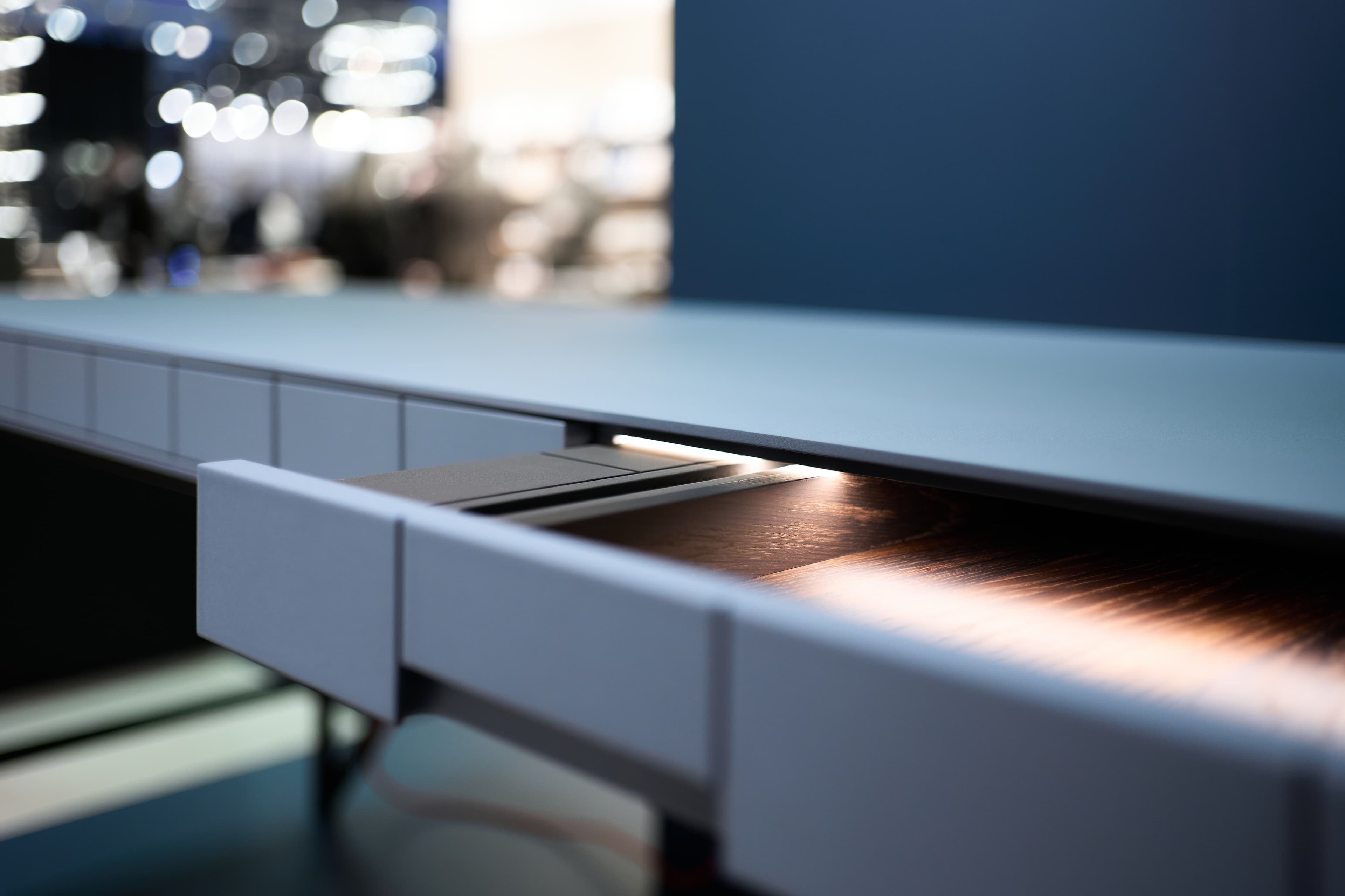 The desk anticipates every aspect of the modern working day. Its metal frame carries the clean form, drawers with tip-on fittings and integrated lighting create a well-thought-out interior, and a concealed secret space provides discreet storage. Smart cable management, integrated USB-C and LAN connectivity keep the workspace free from distraction.